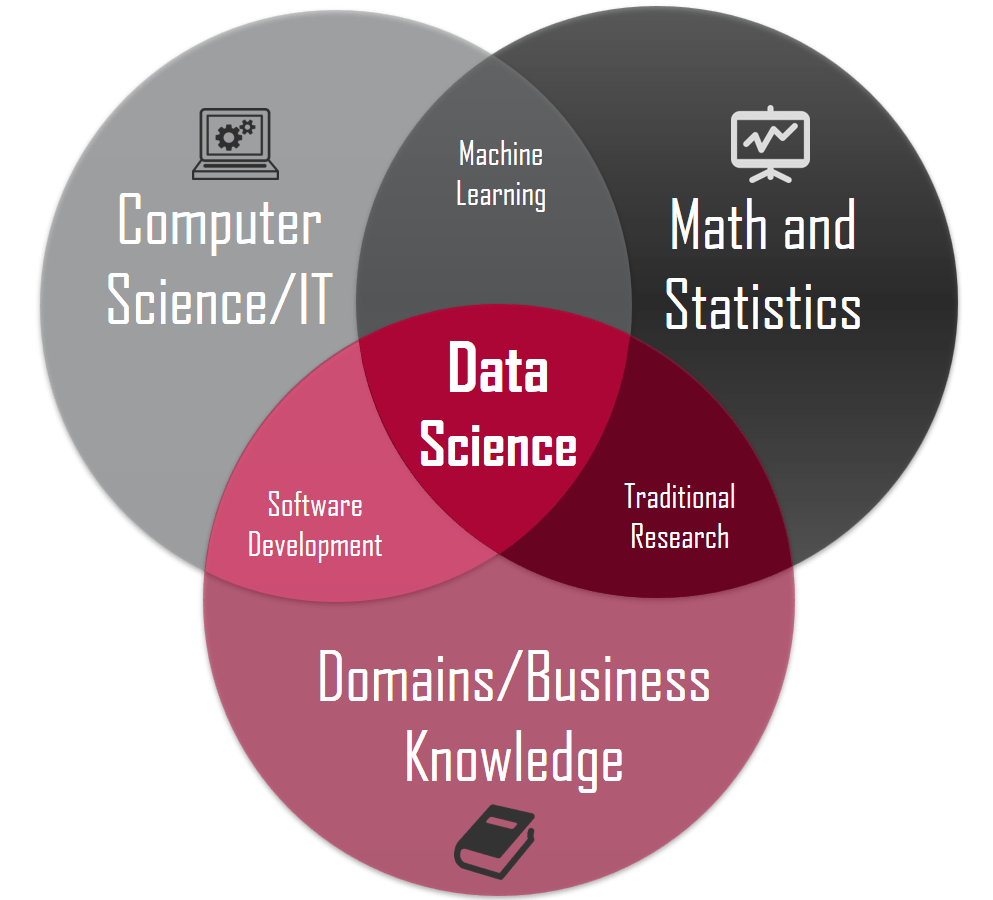 En el esquema podemos observar que un científico de datos no sólo debe de saber de ciencias computacionales, ni de matemática y estadística, también tiene una rama de suma importancia que es un dominio o pericia sobre algún tema en el que se va a aplicar la ciencia de datos, como por ejemplo las finanzas, mercadotecnia, cadenas productivas, etc. Podemos encontrar una infinidad de aplicaciones, pero sería un error considerar al científico de datos un héroe siendo solamente un ingeniero en software o en computación, ya que en ocasiones estos carecen de un entendimiento de negocio, por lo que lo ideal sería que trabajaran en conjunto con alguna persona que sea, si bien no un experto, un conocedor de tecnología y por otra parte, que también sea experto en negocios, para poder empalmar las disciplinas y conseguir realmente los resultados deseados y bien aplicados a la necesidad del área de dominio en la que se quiera implementar.