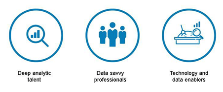 Empezaremos por delimitar los puestos clave dentro de este mundo de Big data y en ellos podemos encontrar 3 ramas fundamentales: Deep analytical talent, Data savvy professionals y Technology and data enablers.