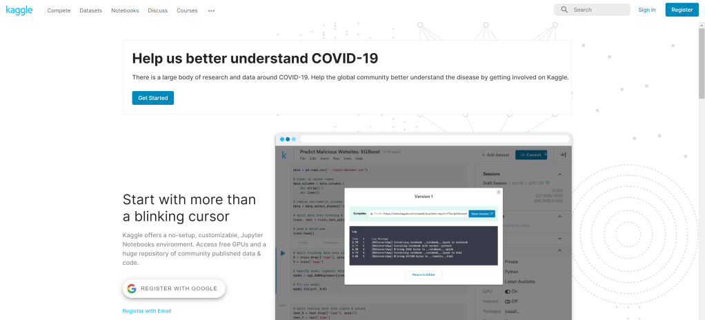 Kaggle es otro recurso muy importante y abierto, aquí puedes encontrar comunidad, desarrollo, noticias, cursos y hasta grandes proyectos, es como llevar tus llaves en la bolsa. Tiene cursos de Machine Learning, Python, Data Visualization, Pandas, Feature Engineering, Deep Learning, SQL, Geospatial Analysis, NLP y más.