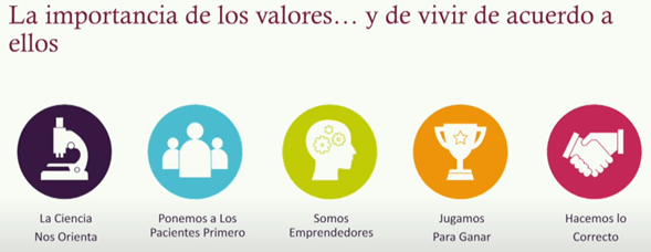 Segundo, establecer un propósito compartido que guía a todos, ese propósito compartido es traspasar las barreras de la ciencia para descubrir medicamentos que cambien vidas. “Nuestra meta común, la razón por la que venimos a trabajar todos los días es innovar […]. Definimos un conjunto de valores que son más que palabras en papel, nos ayudan a impulsar el progreso a diario, así como actuar como un mecanismo de control y equilibrio en todas nuestras acciones”