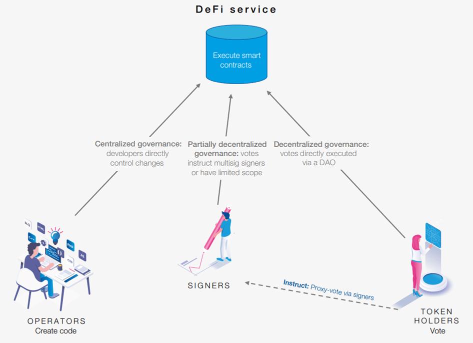 Los desarrolladores de DeFi siguen una trayectoria a medida que el servicio alcanza la madurez, partiendo desde el gobierno centralizado, seguido por el gobierno parcialmente descentralizado y por último el totalmente descentralizado.